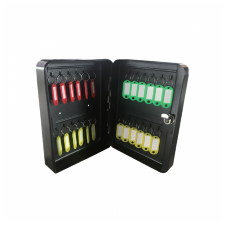 • Un seif cu capacitate de 24 de chei, cu o constructie solida din otel si colturi rotunjite, prevazut cu o incuietoare cu chei, carlige pentru chei si inele cu coduri de culoare.