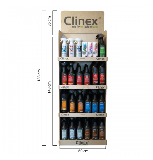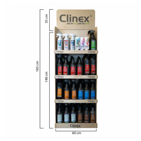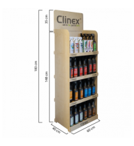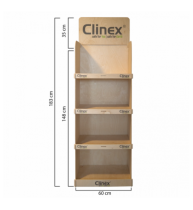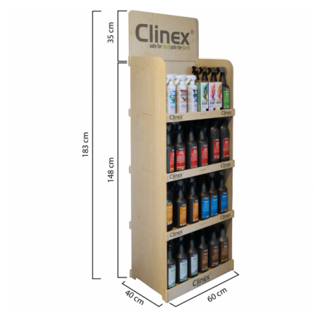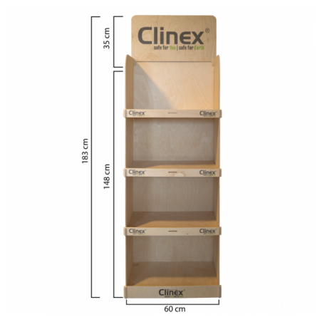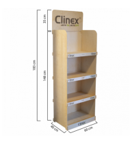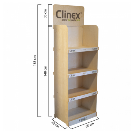• Display-ul de podea din lemn CLINEX, cu dimensiuni de 68x183 cm, ofera o solutie eleganta si robusta pentru prezentarea produselor.