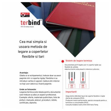 • Masina profesionala de indosariere termica pentru coperti rigide, flexibile si transparente. • Usor de folosit, leaga pana la 500 coli de dimensiune pana la A3. • Leaga pana la 500 pagini pentru copertile flexibile si pana la 80 pagini pentru coperti ri