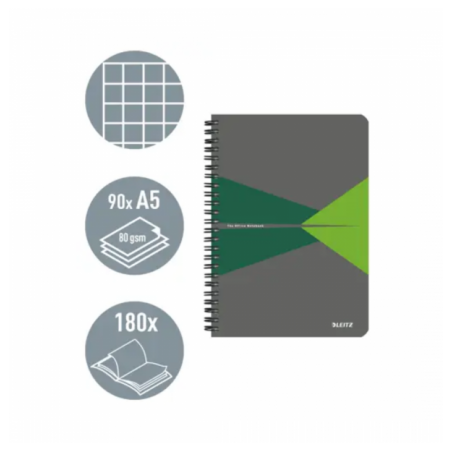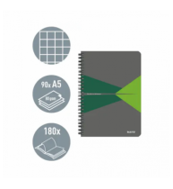 Coperta rezistenta din polipropilena ofera un suport de scris ideal pentru momentele cand va aflati in miscare Usor de rasfoit datorita spirei cu deschidere la 360° Hartie de calitate superioara, opaca si cu suprafata fina – pentru o scriere lina, fara pete Antet pentru titlu si data, util pentru organizarea notitelor Microperforatii care permit desprinderea usoara a colilor 180 de pagini / 90 de coli de hartie A5 certificata FSC®, 80 gsm Culoare: Verde Dimensiuni: 164 x 13 x 210 mm Format: A5 Numar de coli: 90 Descriere: pagini matematica Coperta din: PP (polipropilena)