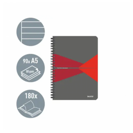 Coperta rezistenta din polipropilena ofera un suport de scris ideal pentru momentele cand va aflati in miscare Usor de rasfoit datorita spirei cu deschidere la 360° Hartie de calitate superioara, opaca si cu suprafata fina – pentru o scriere lina, fara pete Antet pentru titlu si data, util pentru organizarea notitelor Microperforatii care permit desprinderea usoara a colilor 180 de pagini / 90 de coli de hartie A5 certificata FSC®, 80 gsm Culoare: Rosu Dimensiuni: 164 x 13 x 210 mm Format: A5 Numar de coli: 90 Descriere: pagini dictando Coperta din: PP (polipropilena)